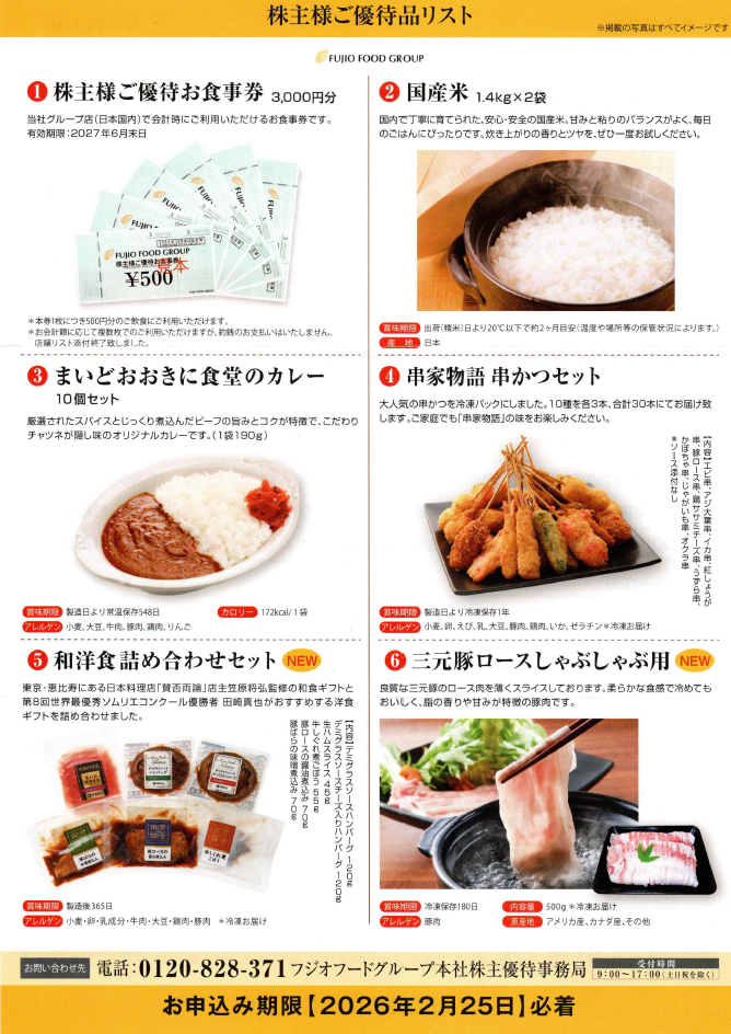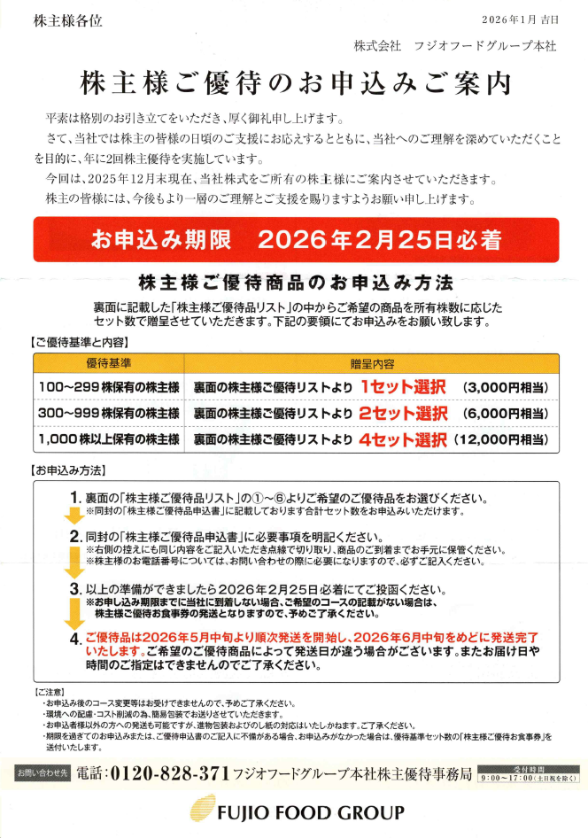 フジオフードさんから株主優待の案内が到着しました♪