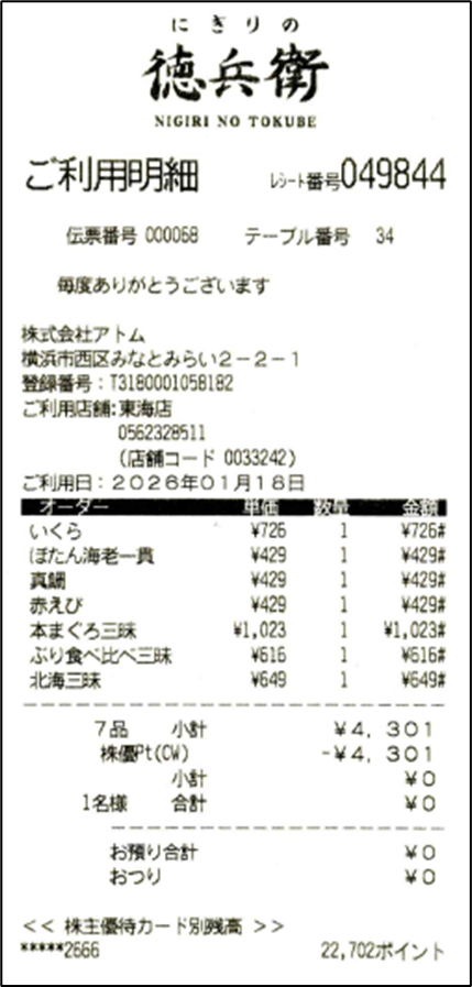 右下:ぼたん海老一貫全部株主優待ポイントで食べれました♪