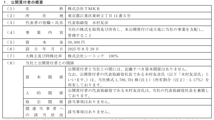 - 買付者は新設会社「株式会社TMKR」で、代表は現社長の木村友彦氏。