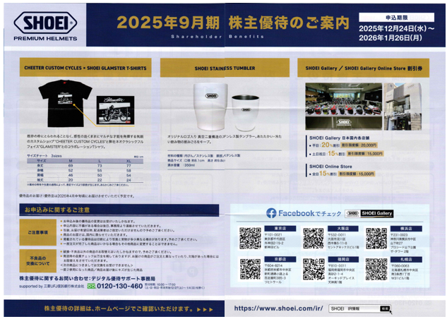 Tシャツまたはノベルティグッズ、もしくはSHOEI Gallery、SHOEI Online Storeで使用できる割引券を受け取ることができます。