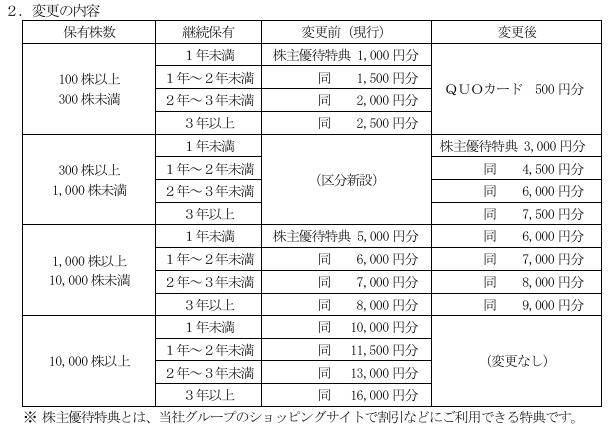 利回りの良い300株優待が追加された代わりに、100株以上保有の株主優待はQUOカードに変更となり、金額が減額されました。