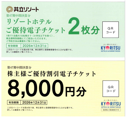 私は保有株数500株のため、8000円分の電子割引券及び2枚分のリゾートホテルご優待電子チケットが届きました😆